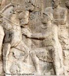 رفتار متفاوت شاپور با والرین و فیلیپ از آن رو است كه فیلیپ در سال 244 میلادی با پرداخت غرامت به شاپور با او پیمان صلح بست در حالی كه والرین در حال نبرد با شاپور دستگیر شد. درست در پشت سر والرین مردی ایستاده كه با خونسردی به دسته شمشیر تكیه داده است. او ولیعهد شاپور، هرمزد اردشیر است. نفر سمت راست نایب السلطنه شاپور بیدخش است كه هر دو دست را به نشانه احترام بلند كرده است. فرشته ای شناور در بالای اسب شاپور در حال دادن دیهیم شاهی به اوست .