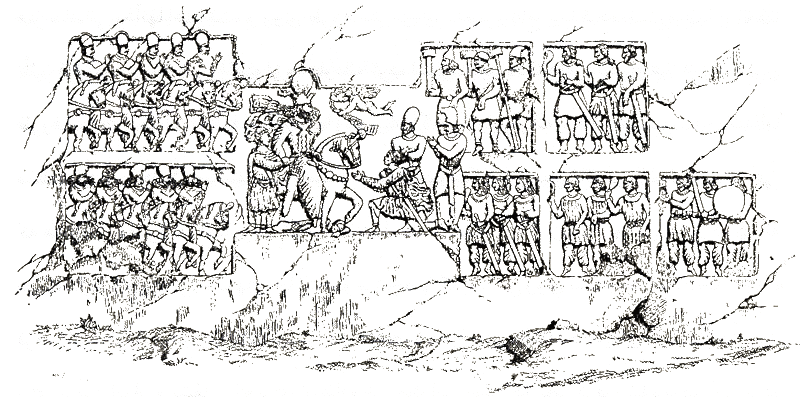 در سمت راست رودخانه سنگ نگاره ای به پهنای 12.40 وارتفاع 4.69 متر از شاپور به یادگار مانده است. در این سنگ نگاره شاپور سوار بر اسب رو به سمت چپ دارد. جسد گوردیان زیر پای اسب افتاده است. شاپور با دست راست امپراتور فیلیپ عرب را گرفته است و فیلیپ با توجه به سنت دربار ایران دستها را در زیر آستین پنهان كرده است. والرین جلوی اسب شاپور زانو زده و این بار هم مسلح است و شمشیر رومی خود را از بازوی چپ آویخته و شنلی شال مانند و مواج بر دوش دارد .