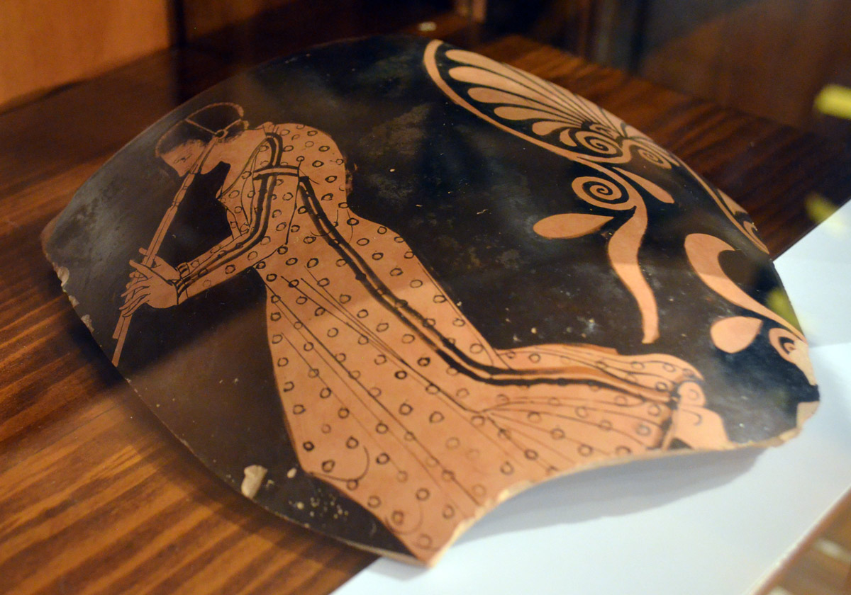 قطعه سفال از جنوب ایتالیا با طرح زن جوان در حال نواختن دو فلوت. 420-390 پیش از میلاد