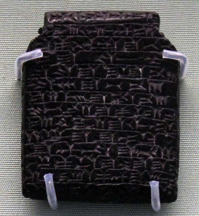 سنگ کوچک کتیبه دار کوچک جهت آویزان کردن که متنی است برای حفاظت انسان از شیاطین - هفت نشانه در متن هفت بار تکرار شده اند. |