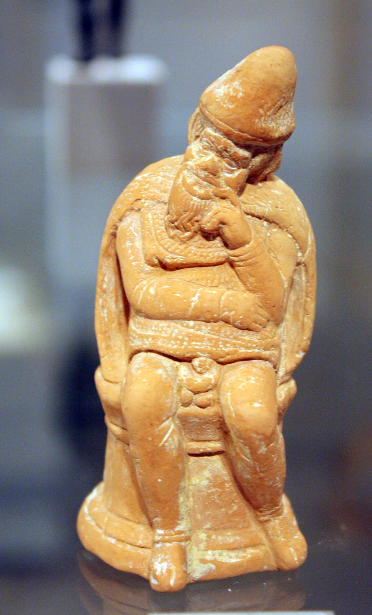 یکی دیگر از مجسمه های یافت شده از آتیک یونان که یک بازیگر تئاتر را در حال نشسته نشان می دهد. او ماسک بازیگری نیز دارد. سده چهارم پیش از میلاد