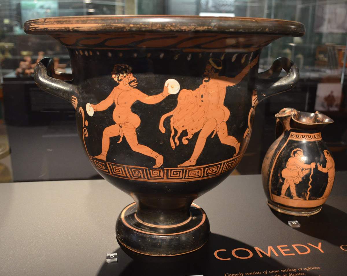 کوزه ای از جنوب ایتالیا با نقش دو بازیگر لخت با ماسک تئاتر حدود 375-350پ م