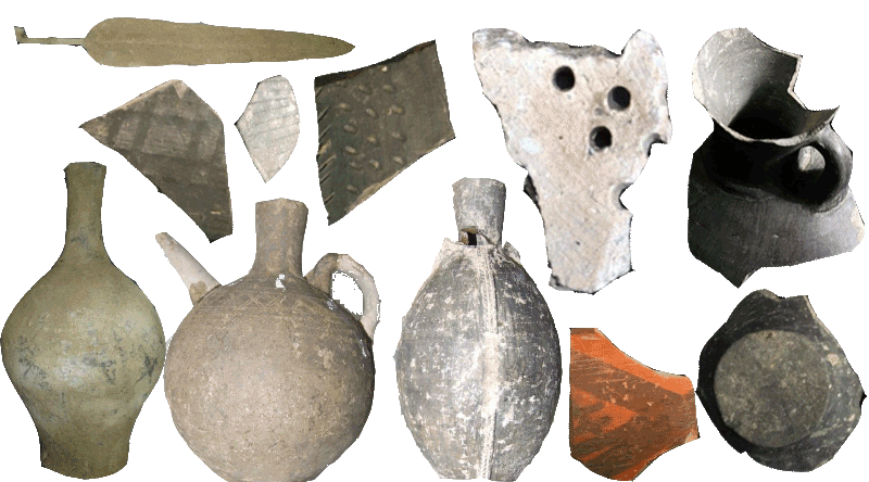 سفال خاکستری تیره و روشن بیشترین نوع سفالهای کشف شده را تشکیل میدهند. تزئینات بکار رفته بر روی سفالهای خاکستری ، شامل نقوش داغدار بصورت خطوط موازی و متقاطع، و همینطور نقوش کنده بصورت خطوط موازی می باشد. این گونه سفالین اکثرا دارای آمیزه ماسه ریز بوده . در بخش غربی تپه سه ظرف سفالین بدست آمده که دو نمونه آن خاکستری بوده است. یکی از ظروف بصورت خاکستری تیره بوده که دارای نقش گندمی افزوده می باشد. نمونه چنین ظرفی در تپه حصار دامغان و در دوره IIIC گزارش شده است. ظرف سفالین دیگر بصورت خاکستری روشن و از نوع ظروف لوله دار است که شامل یک دسته نیز بوده ودارای تزئین نقش سوزنی در بخش بالایی بدنه می باشد. یک ظرف سفالین نا متقارن که از لحاظ تکنیک ساخت در سطح بالایی قرار نداشته در کنار تدفین یافت شده قرار داشته است، که این ظرف فاقد هرگونه تزئینی بوده است .