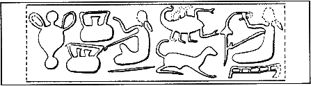 طرح یكی از مهر های مكشوفه در تپه چغامیش -دوك نخ ریسی، سفال گری و حیوانات |