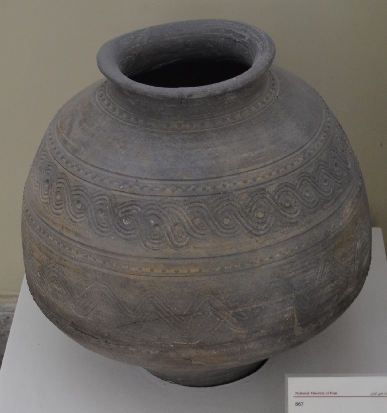 ظرف سفالی با نقش کنده سیلک – هزاره اول پیش از میلاد – موزه ایران باستان
