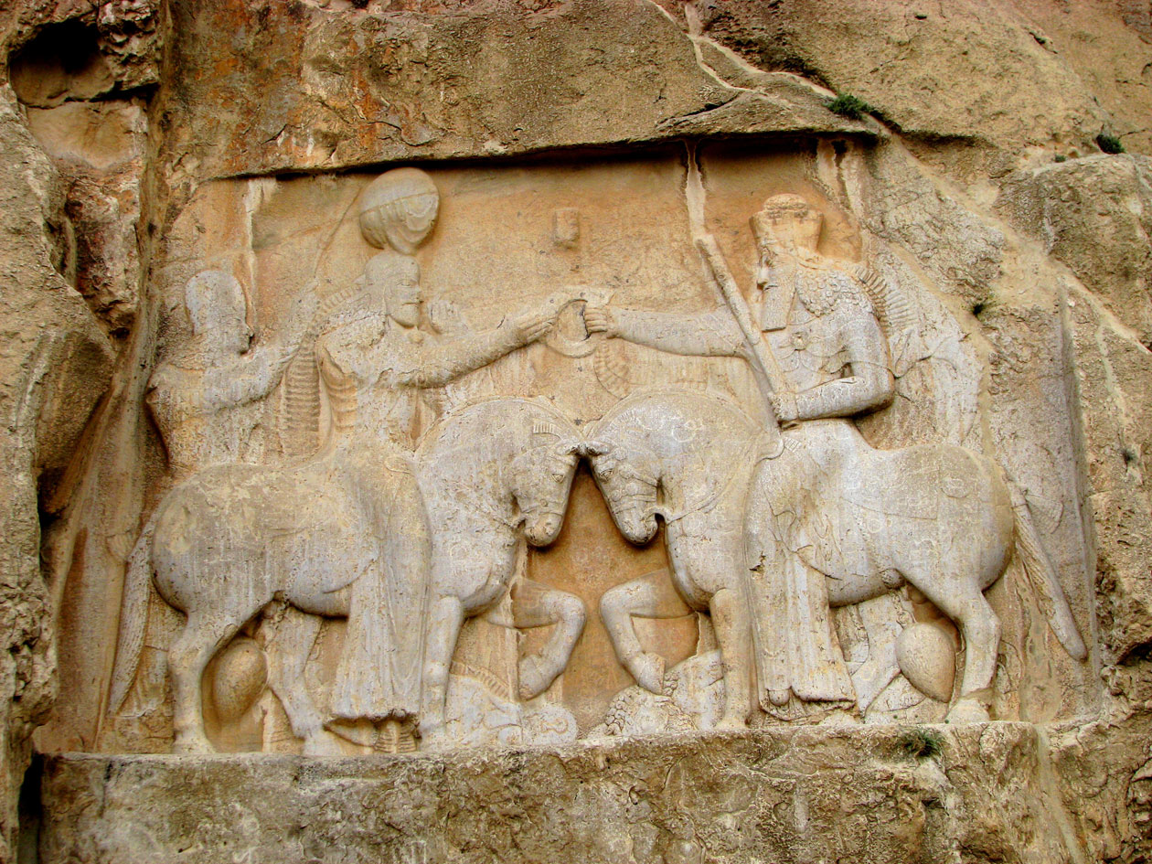 اردشیر اول - اعطای نشان شاهی در نقش رستم اردشیر اول تصویری از دیهیم ستانی خود از اهورامزدا را در نقش رستم بر جا گذاشته است. او پس از آنكه بر اردوان پنجم اشكانی پیروز شد، این سنگ نگاره را طراحی كرده است كه هم نزدیك به شهر استخر است و هم نزدیك به تخت جمشید هخامنشی. اهورامزدا در سمت راست اردشیر است و هر دو سوار بر اسب هستند. اهورامزدا دیهیم پادشاهی را به اردشیر می دهد. |